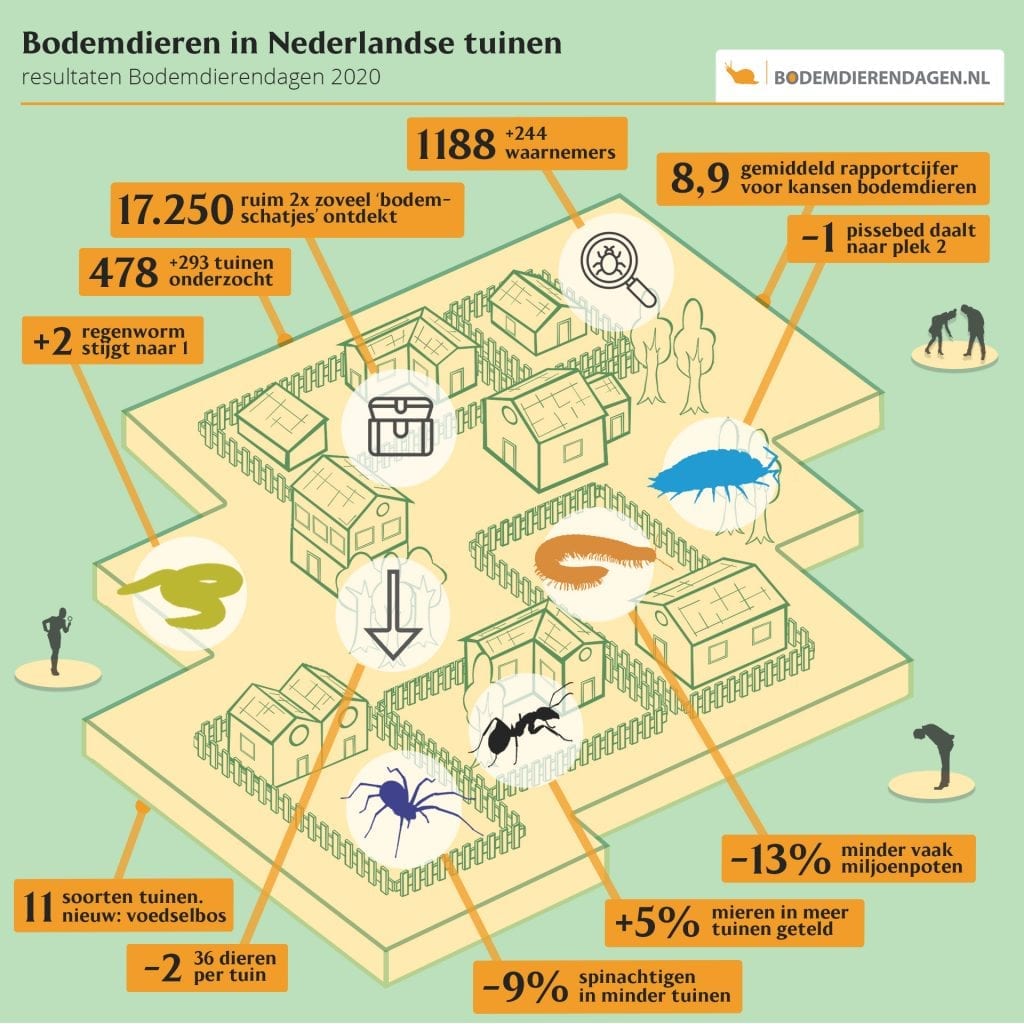 Op de speciale resultatenpagina met kaarten per diergroep en cijfers per tuintype is meer informatie te vinden over de resultaten van de Bodemdierendagen 2020.