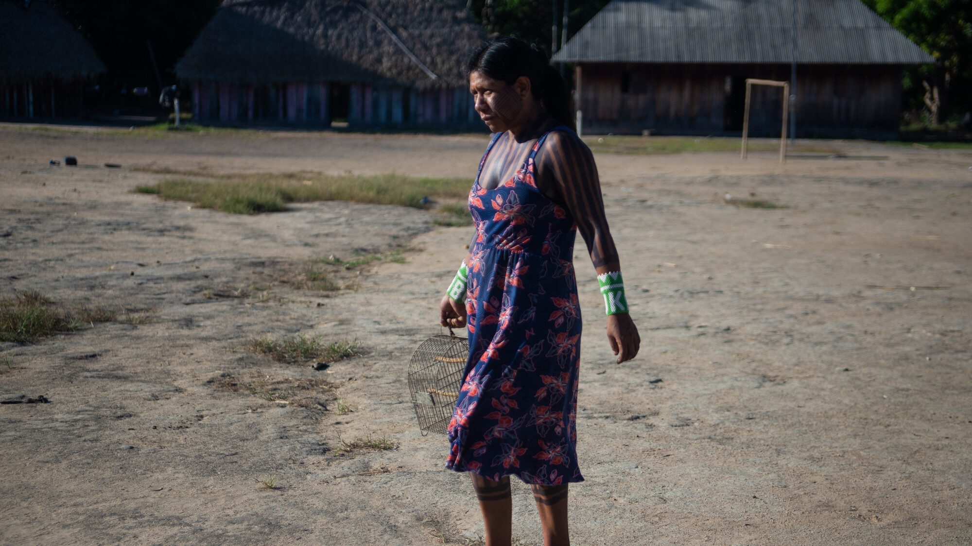 Links: Aldeia Baú, Pará, Brazil, a village where the Kayapó indigenous community lives, situated in the Amazon. © Cícero Pedrosa Neto / Global Witness. Rechts: Cacica Pa’nho, member of the Indigenous Kayapó community, in Baú village, Pará, Brazil. © Karina Iliescu / Global Witness
