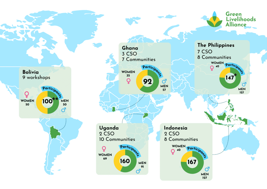 Through the Green Livelihoods Alliance (GLA) Forests for a Just Future programme, IUCN NL and its partners worked to improve the civic space for (W)EHRDs and CSOs so that they can continue their vital work. For clarification’s sake, a CSO can in its turn also consist of (W)EHRDs but that does not necessarily need to be the case. To improve civic space, it is important that IUCN NL’s partners feel safe and secure in performing their activities. That is why we initiated and facilitated a three-year long safety & security strengthening programme together with Protection International in five countries: Bolivia, Ghana, Uganda Philippines and Indonesia. By strengthening IUCN NL’s partners in these countries and the communities they work with- through training and security planning – they become better prepared and empowered to respond to risks and challenges.