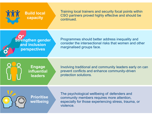Throughout the safety & security strengthening programme, several lessons learned emerged that offer valuable insights for future initiatives. Each country is dealing with a different context and challenges: from the limited familiarity of local communities in Indonesia with human rights concepts to the influence of South Sudanese refugees in Uganda and the impact of Chinese mining activities in Ghana. However, some lessons learned are relevant across all contexts as is shown in the graphic below.
