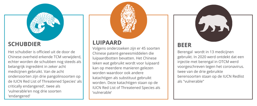 Uit diverse rapportages blijkt dat een aanzienlijk deel van de illegale handel in wilde bedreigde dieren gedreven wordt door de vraag die er is vanuit traditionele Chinese medicijnen (TCM). Hoewel slechts een klein percentage van TCM gebruik maakt van deze dierlijke ingrediënten, zorgt het er wel voor dat specifieke diersoorten nog verder onder druk komen te staan. Schubben van schubdieren, hoorn van neushoorns en lichaamsdelen van de tijger worden nog steeds op grote schaal illegaal verhandeld ondanks dat deze diersoorten ernstig bedreigd zijn. Inmiddels wordt er uitgeweken naar andere diersoorten ter vervanging. Zo is de tijger van oudsher een dier dat geliefd is binnen een specifiek gedeelte van TCM. Doordat dit dier in het wild haast niet meer voorkomt en daarom zeer lastig te bejagen is, wordt nu uitgeweken naar andere katachtigen. Luipaarden, leeuwen, sneeuwluipaarden en jaguars worden met regelmaat aangetroffen als ingrediënten in TCM-producten.