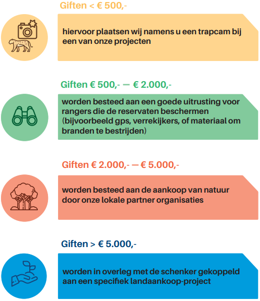 Soms kan met de aankoop van een relatief klein gebied al een cruciale verbinding gemaakt worden tussen twee geïsoleerde stukken bos. Hierdoor wordt het leefgebied van tal van soorten, zoals papegaaien, olifanten, apen en jaguars, in een klap een stuk groter.